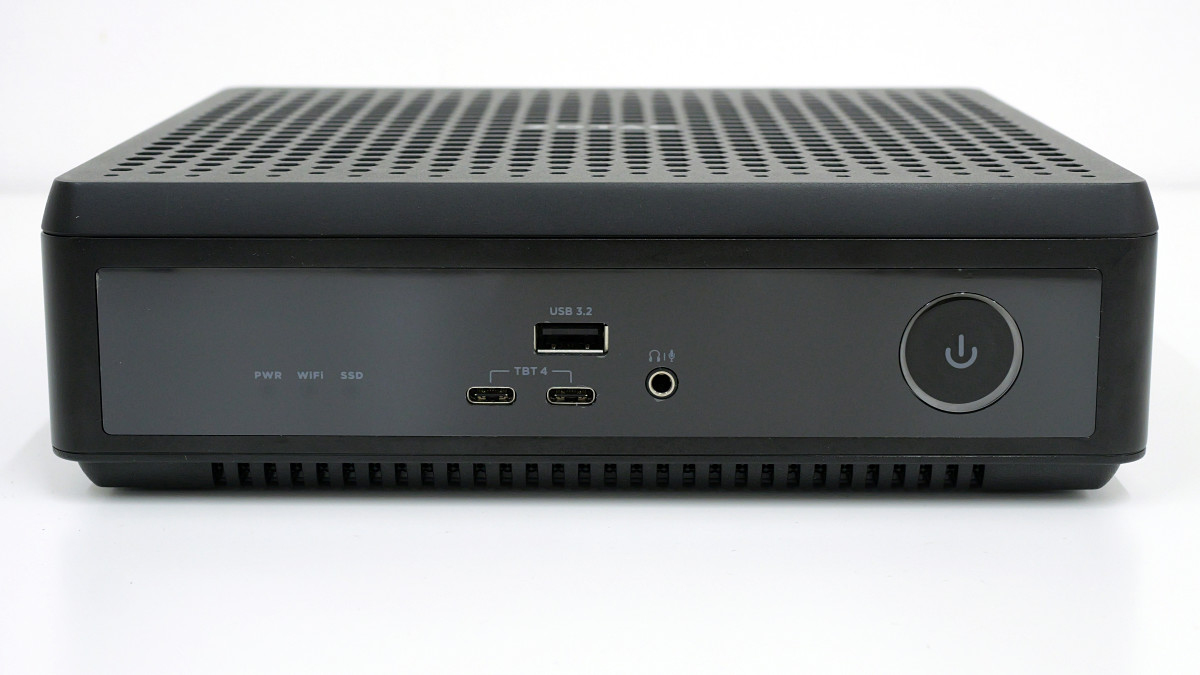 On the front there is one USB Type-A port that supports USB 3.2 Gen 2 and two USB Type-C ports that support Thunderbolt 4. There is also an earphone jack and a large power button.