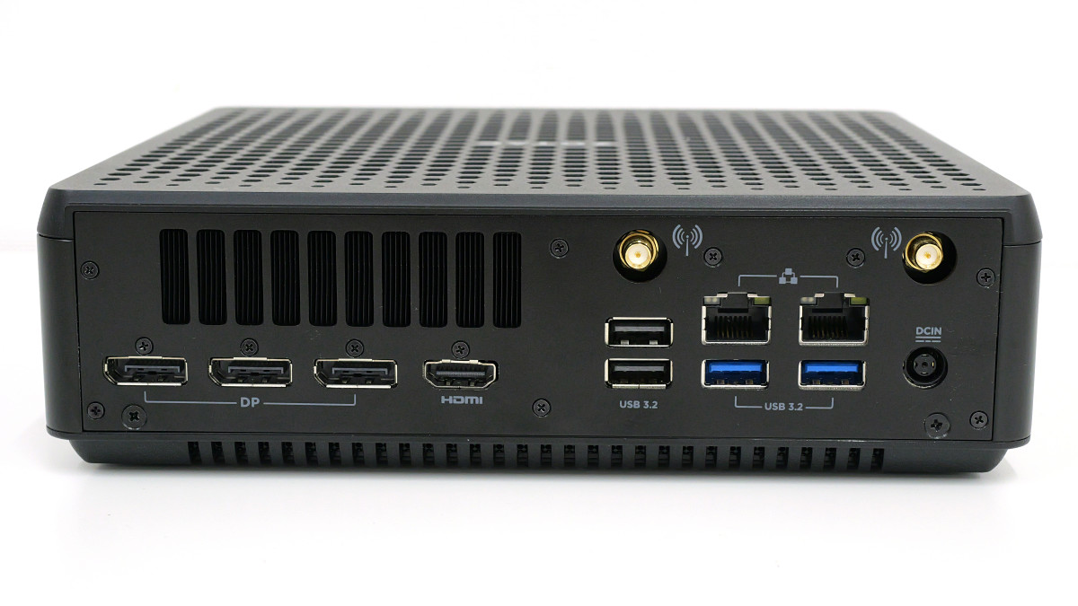 On the back are three DisplayPort 2.1b ports, one HDMI 2.1b port, four USB Type-A ports that support USB 3.2 Gen 2, two 2.5Gbps Ethernet ports, and one power input port.
