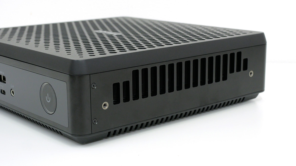 On the left side there are ventilation holes and a security slot (Kensington lock) for attaching a security wire or similar.