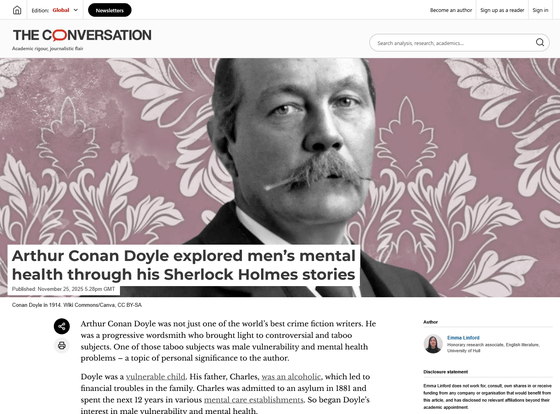 Emma Linford, an honorary researcher at the University of Hull in the UK, argues that Arthur Conan Doyle, the creator of the world-famous detective Sherlock Holmes, used Holmes to highlight taboo topics such as male fragility and mental health issues.