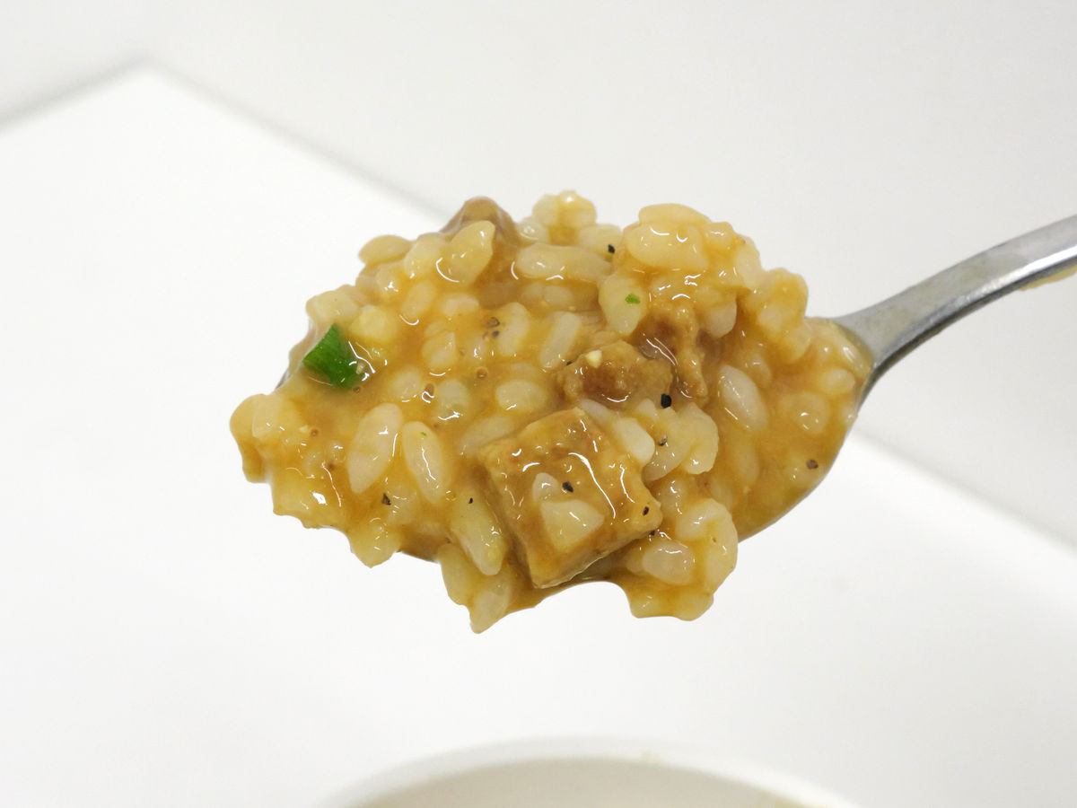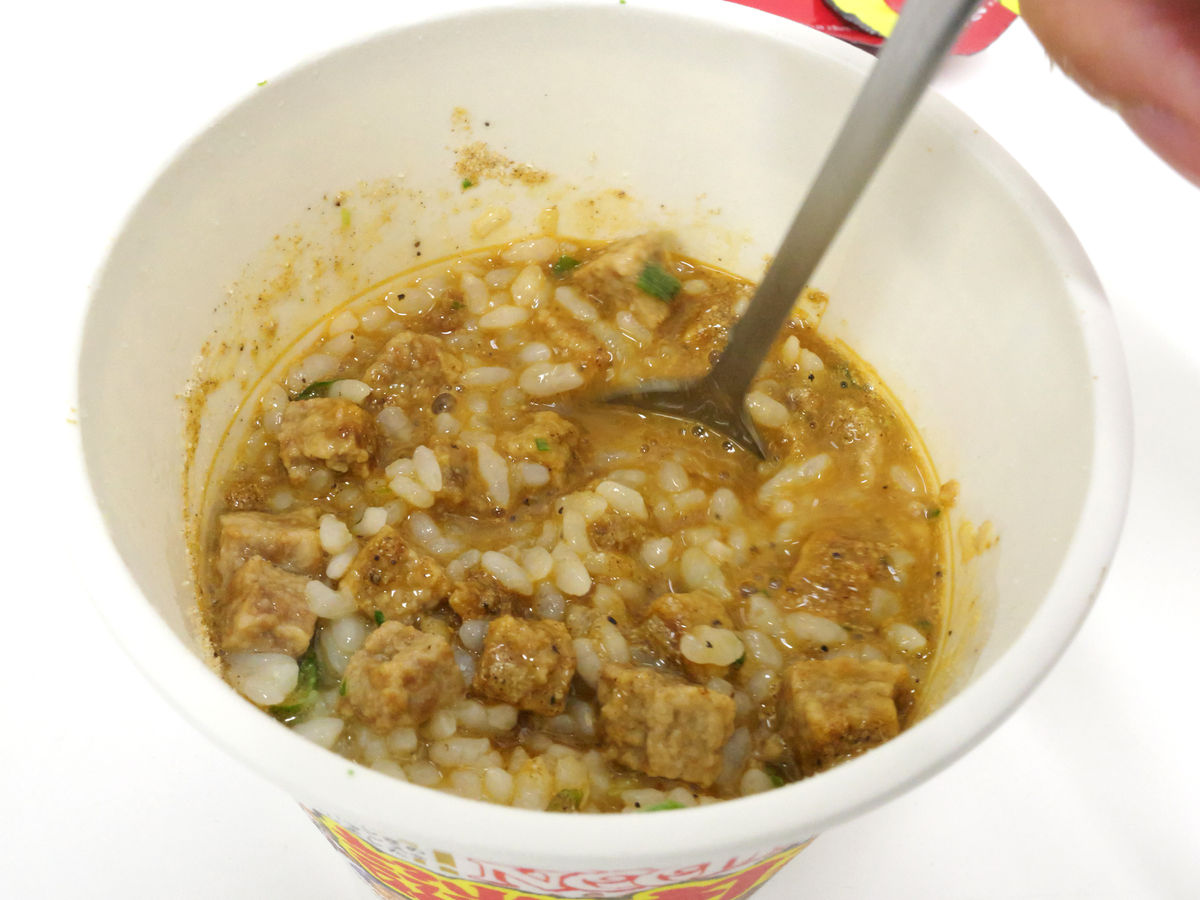 Once it thickens, it's done. The rich flavor and aroma of the spices lingers throughout the meal. While the thick soup is barely recognizable as having a soy sauce base, it's overpowered by the power of the spices and plays a key role. There's also a mysterious, powdery aroma that's neither soy sauce nor spice, but I couldn't pinpoint its origin. The rice has a distinct graininess, with each grain clearly visible, and a pleasant texture, but the flavor is dominated by spices, so I didn't really understand what I was eating until the very end. The 'mystery meat'—a generous amount of it—seems similar to the mystery meat in Cup Noodles, and is quite well-seasoned. While I'm eating something fuzzy, my tongue touches the mystery meat, and my sense of taste returns, then it returns to its fuzzy state again, creating a mysterious sensation. Thanks to the spices, there's no harshness or bitterness, but on the contrary, it's just spicy.