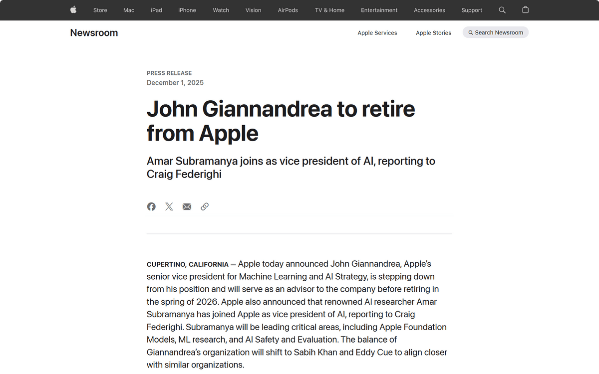 On December 1, 2025, Apple announced Giannandrea's retirement, stating that he would retire in January 2026.