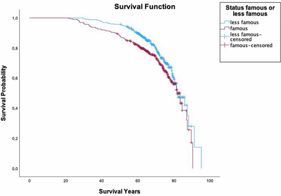The graph below shows famous singers in red and less famous singers in blue, with the vertical axis representing survival rate and the horizontal axis representing age. The difference in mortality rate between famous and less famous singers begins as early as their 20s, and the less famous singers tend to have a higher survival rate almost consistently.