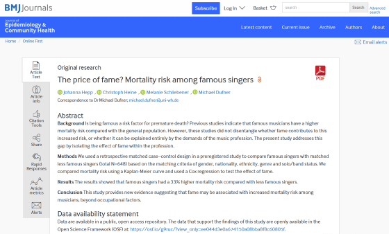 With the news often reporting the deaths of singers and artists, some people may feel that 'famous people tend to die early.' A new study comparing 'famous singers' with 'less famous singers' has revealed that famous singers tend to live shorter lives than relatively less famous singers.