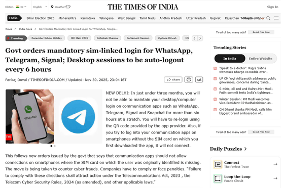 Govt orders mandatory sim-linked login for WhatsApp, Telegram, Signal; Desktop sessions to be auto-logout every 6 hours | India News - The Times of India