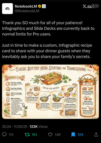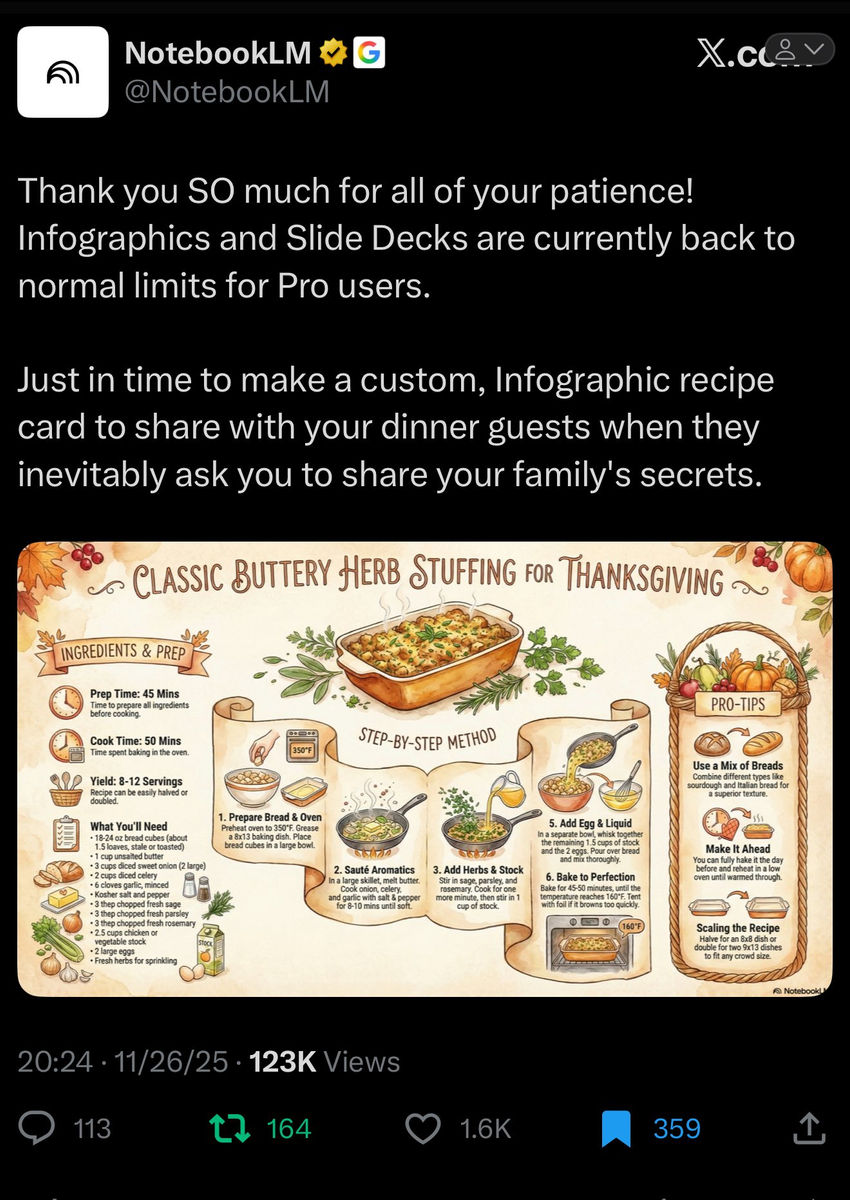 In November 2025, Google announced Nano Banana Pro , its most powerful image generation model to date. It was also promoted for its exceptional infographic generation capabilities, and NotebookLM's official Twitter account even posted 'AI-generated recipe images' as part of its promotion of Nano Banana Pro.