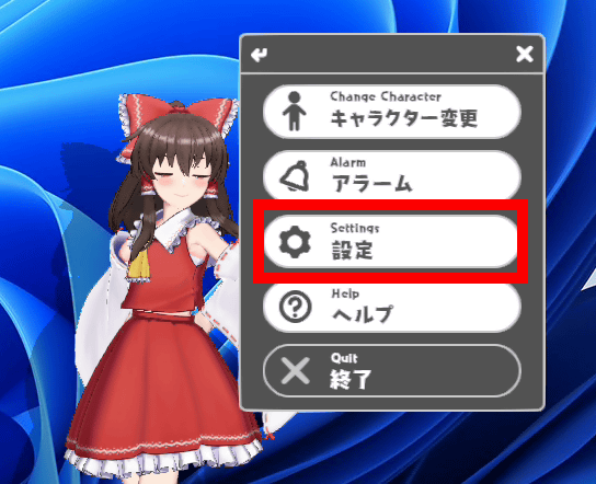 'Desktop Mate Hakurei Reimu DLC' comes with two wallpapers, so let's check them out. Click 'Settings' in the right-click menu.