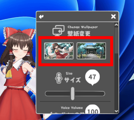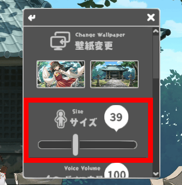 You can also adjust Reimu's size between 1 and 100 by moving the slider in the size field on the settings screen.