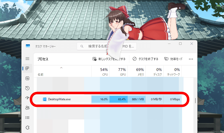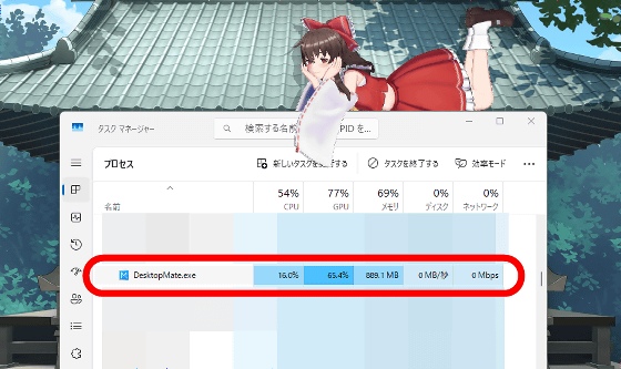 Desktop Mate is an app that draws characters in 3D, so it places a considerable load on the GPU. For reference, on a laptop equipped with an Intel Core i7-1065G7 , Desktop Mate's GPU usage was around 68%. This won't be a problem in an environment with a dedicated GPU, but in an environment with only an iGPU, the PC may run slowly.
