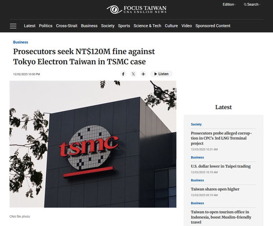 On December 2, 2025, local time, Taiwanese prosecutors indicted Tokyo Electron Taiwan , a Taiwanese subsidiary of Tokyo Electron , a Japanese semiconductor manufacturing equipment manufacturer. The prosecutors are seeking a fine of NT$120 million (approximately JPY 595 million) for allegedly stealing 2nm technology from TSMC , the world's largest semiconductor contract manufacturer (foundry).