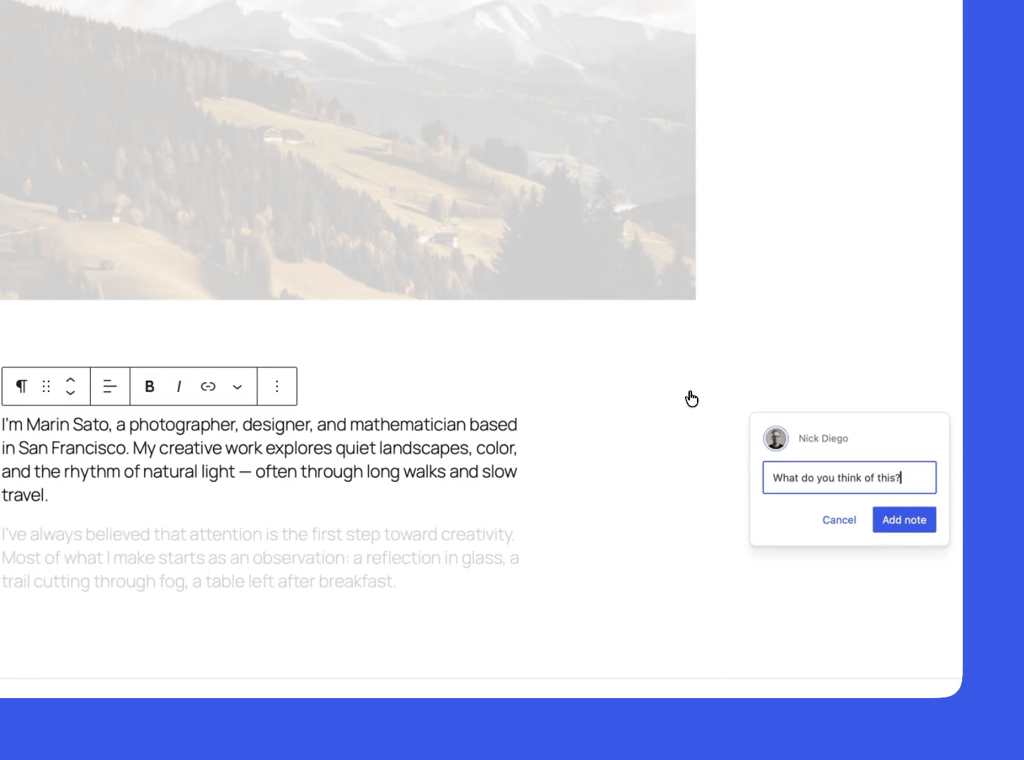 First, in terms of collaboration and content management, we've added block-level notes, which allow you to leave feedback directly on the specific block that needs fixing, with threaded conversations and resolved status tracking. Authors will also receive email notifications for new comments, ensuring no one misses a beat.