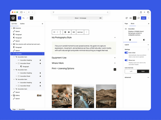 There are also a number of new blocks that will help you to express your content better. The Accordion block lets you create collapsible sections with headings and panels, making it ideal for setting up FAQs and other content without the need for a plugin.