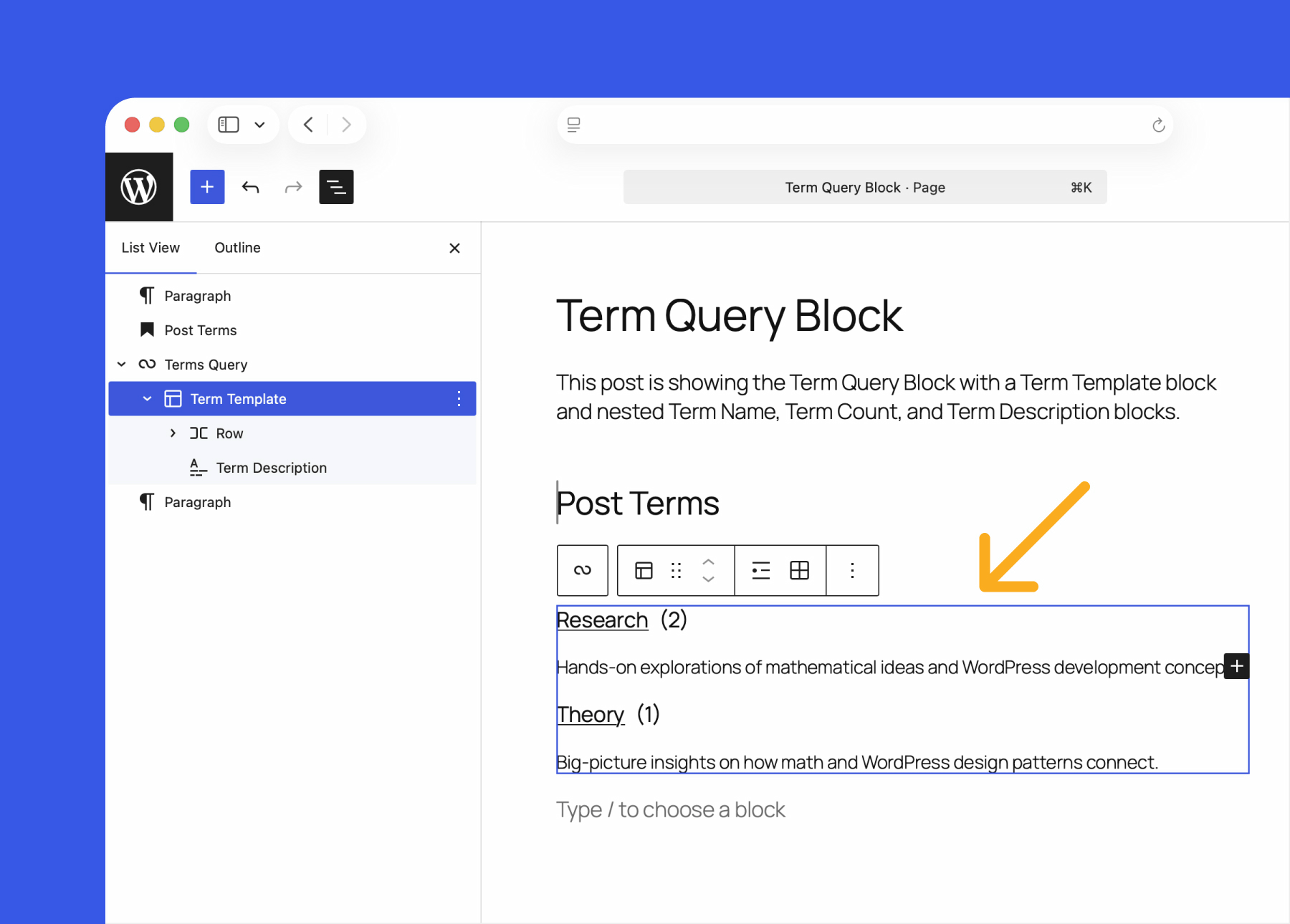 The Term Query block simplifies building categories and tags pages, with sorting and filtering capabilities. Related blocks include Term Template, Term Name, and Term Count.