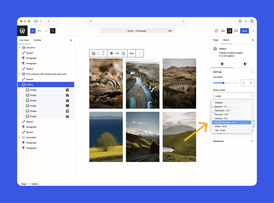 Image management has also been streamlined, with the Gallery block now allowing you to unify the aspect ratio of all images with one click from the sidebar, and the Cover block, which uses video backgrounds, now allows you to set a poster image to display while the video is loading, making it easier for users on slower internet connections.