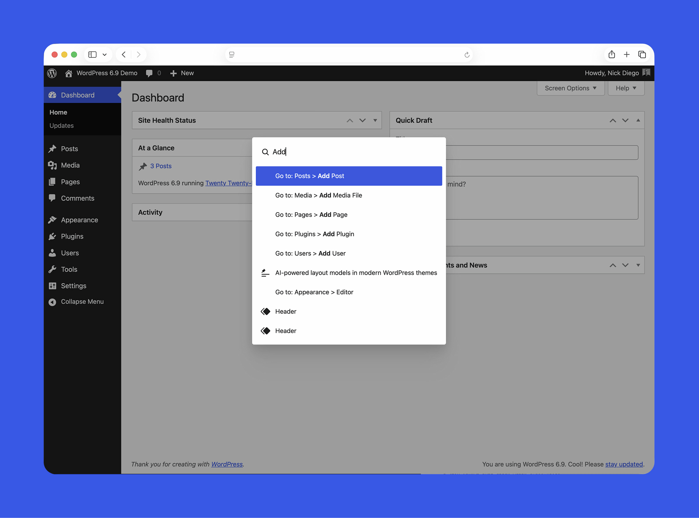 There are also some important updates to the admin and performance: the command palette is now available across the admin screens, not just the site editor, and you can now use the Ctrl or Cmd + K shortcut to quickly find and run functions from any screen.