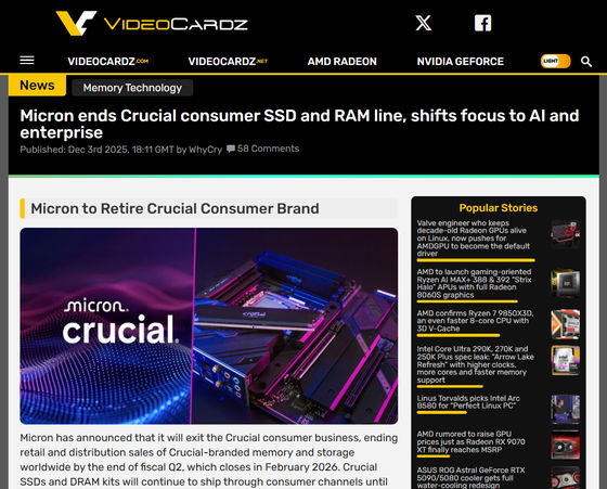 Prior to Micron's announcement of the end of Crucial, technology media outlet VideoCardz reported that 'Micron is discontinuing Crucial's consumer SSD and RAM lines to focus on AI and enterprise.'