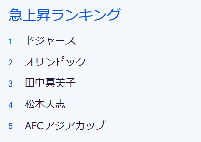 By the way, the ranking of rising words for 2024 is as follows: 1st place 'Dodgers,' 2nd place 'Olympics,' 3rd place 'Mamiko Tanaka,' 4th place 'Hitoshi Matsumoto,' and 5th place 'AFC Asian Cup,' with popular figures and sports-related words ranking high.