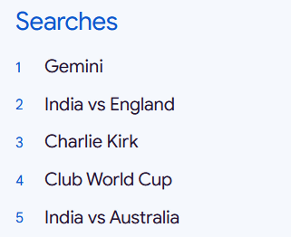 The global trend rankings for 2025 are as follows. Coming in at number one is Google's AI, Gemini. Cricket-related terms 'India vs England' and 'India vs Australia' come in second and fifth. Third place is 'Charlie Kirk,' a conservative activist who was shot and killed in September 2025.