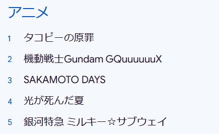 In anime, ' Takopi's Original Sin ' came in first, followed by ' Mobile Suit Gundam GQuuuuuuX .' Galaxy Express Milky☆Subway , which gained popularity on YouTube, came in fifth.