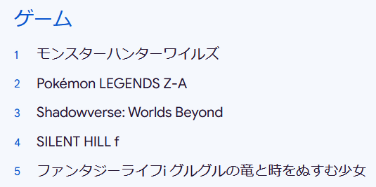 The top game was ' Monster Hunter Wilds ,' followed by ' Pokémon LEGENDS ZA ,' ' Shadowverse: Worlds Beyond ,' ' SILENT HILL f ,' and 'Fantasy Life i: Guru Guru's Dragon and the Girl Who Steals Time .'
