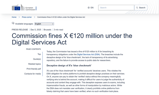 The European Commission, the EU's policy enforcement body, has announced that it will impose a fine of approximately 120 million euros (approximately 22 billion yen) on X for violating its transparency obligations under the Digital Services Act. The Commission cited X's 'deceptive design of its checkmarks,' 'lack of transparency in its advertising repository,' and 'failure to provide researchers with access to public data' as violations of the Digital Services Act.