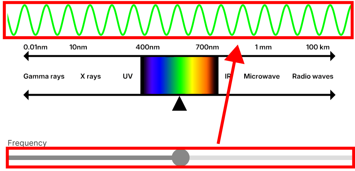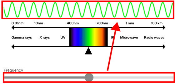 When the wavelength is between approximately 400nm and 700nm, the human eye perceives it as visible light. Moving the bar changes the frequency and color of the electromagnetic waves.