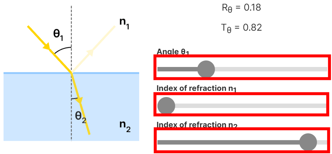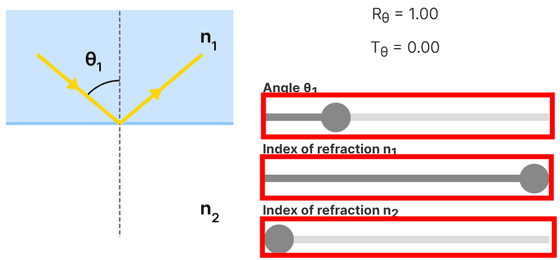 The magnitude of transmitted light Tθ can be calculated from the magnitude of reflected light Rθ using the formula 'Tθ = 1 - Rθ.' By changing the angle of incidence θ1 of light and the refractive indexes n1 and n2 using the bar, the magnitude of reflected light and the magnitude of transmitted light can be calculated and reflected in the diagram.
