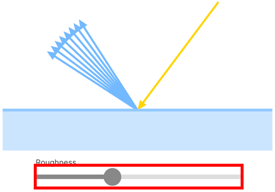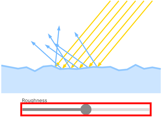 The normals of the microfacet model become less aligned as the surface becomes rougher. By moving the bar, you can change the surface roughness, and you can see how the direction of light reflection becomes more distorted as the surface becomes rougher.