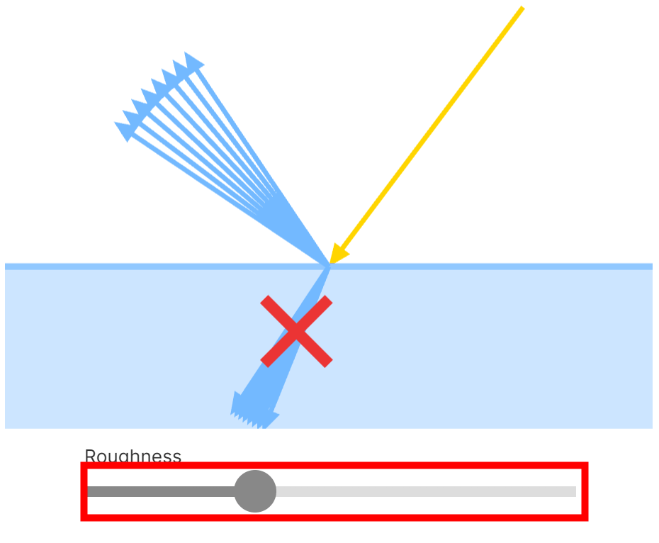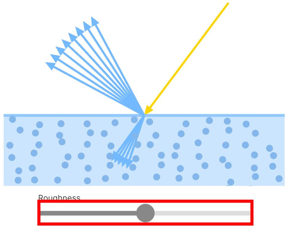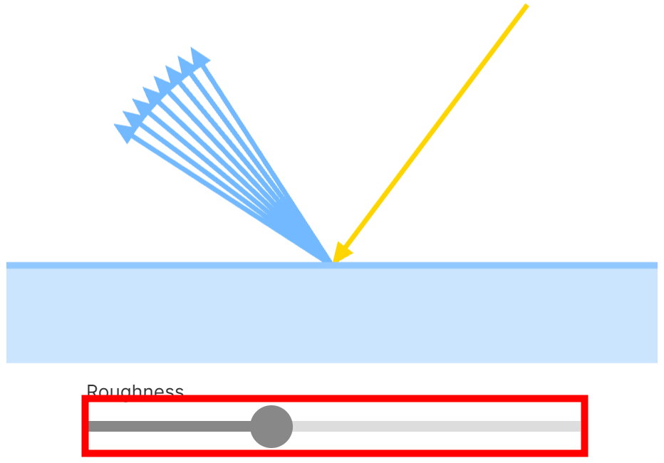 When a photon hits a dielectric material, it is only absorbed if its energy matches the energy of an electron in the object; if it does not, specular reflection occurs. A further phenomenon called diffuse reflection occurs, where light refracts within the dielectric material, interacting with pigments in the material and bouncing around before exiting the surface. Surface roughness affects specular and diffuse reflection. By moving the bar to change the surface roughness, you can see how specular and diffuse reflection change.