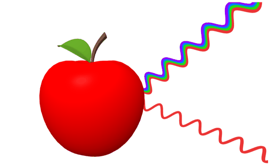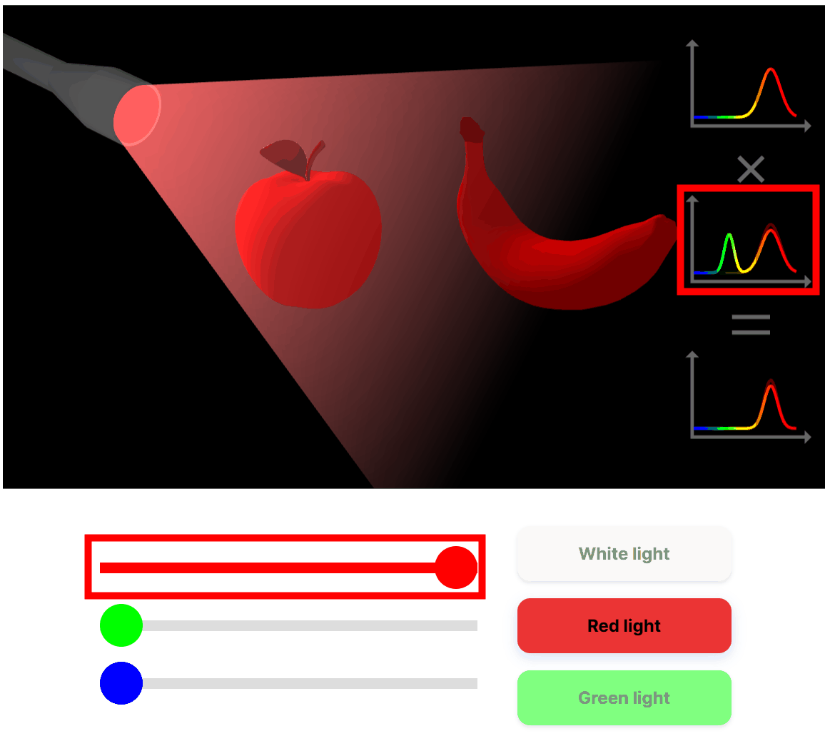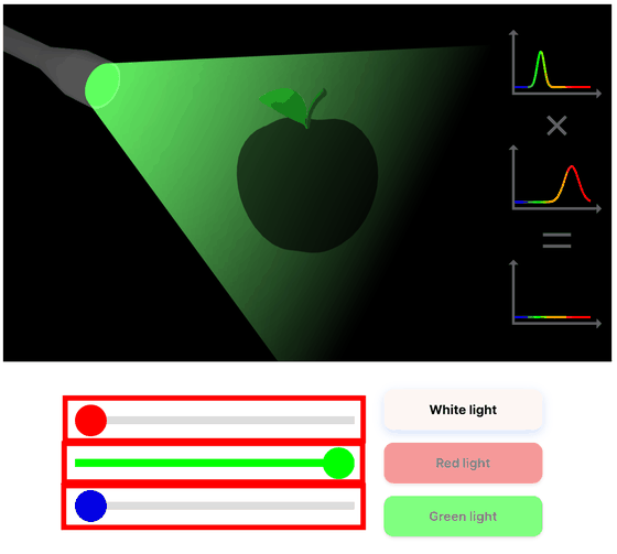 The color of an object appears to be the result of a combination of the spectral distribution of the light source and the object's spectral reflectance. If you shine white light on a red apple, the apple will appear red, and the same result can be achieved with red light. However, if you shine green light on it, the rest of the apple, except for the leaves, will not reflect light and will appear black. The site has bars that allow you to adjust the intensity of the red, green, and blue light emitted by the flashlight, and you can see how the red apple will appear according to the SPD.