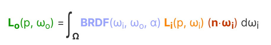The rendering equation derives the outgoing light Lo reflected at point p towards direction ωo by summing all incoming light Li coming from directions ωi in the hemisphere Ω, weighted by the BRDF at that point and a cosine term.