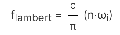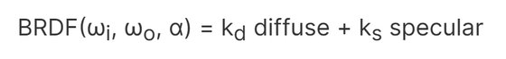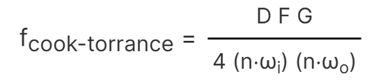The BRDF is the most important part of the rendering equation, it describes the surface of a material and its appearance. Here, microfacet theory and energy conservation can be applied to make the rendering model physically based. It represents the incoming light direction ωi and the outgoing light direction ωo, the surface roughness α, and the diffuse and specular reflection components weighted by the coefficients kd and ks respectively.