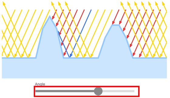 In the diagram below, the red incident light ray is in a state called shadowing, where it cannot bounce back in the direction of emission. The blue incident light ray is blocked on its way to the emission direction, a state called masking. Moving the bar changes the angle of the incident light ray, resulting in changes to the red shadowing light and blue masking light.
