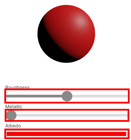 These formulas are combined to produce physically based rendering, which the site allows users to visualize by changing the surface roughness, metalness value, and base color on the bars.