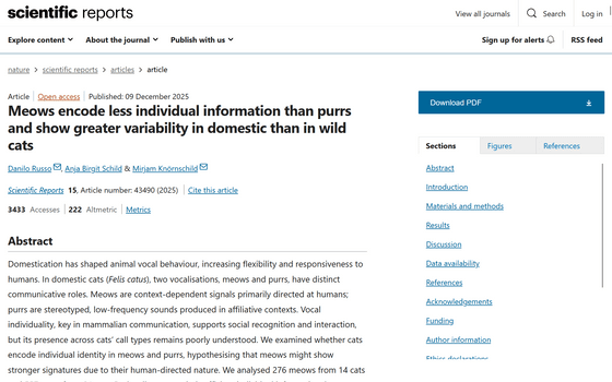 Furthermore, when comparing domestic and wild cats, it was revealed that the meowing sounds of domestic cats are much more diverse than those of wild species.