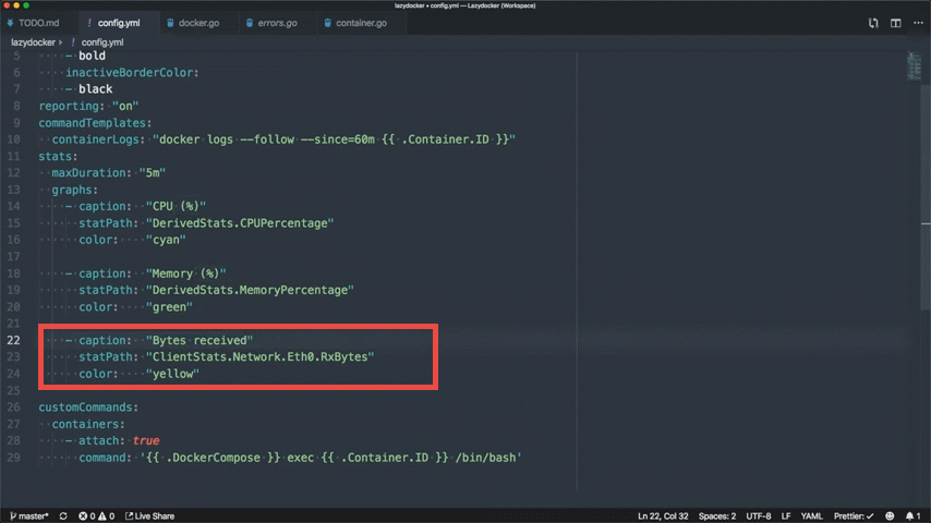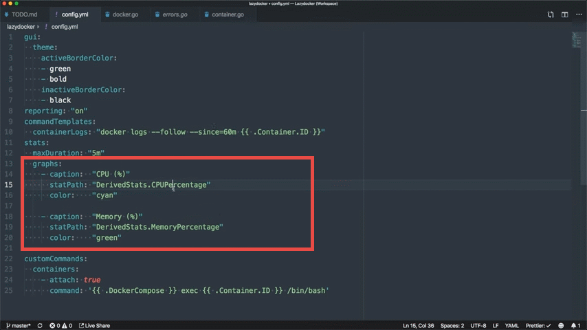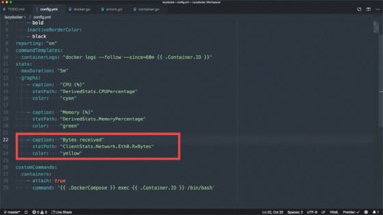 A YAML format configuration file will be displayed. If you check 'graphs' under 'stats,' you will see that graphs for 'CPU (%)' and 'Memory (%)' have been defined.