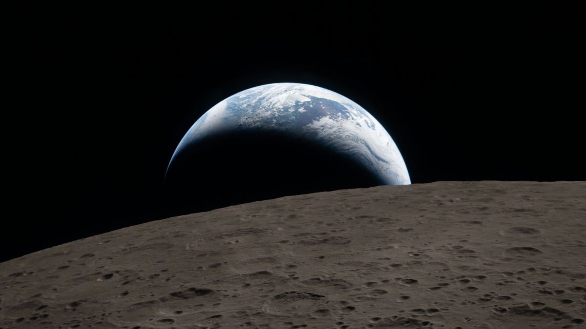 This is a photograph of 'Earthset,' the moment when the Earth sinks below the surface of the Moon. The sight of our own planet sinking below the horizon of another planet is truly magical.