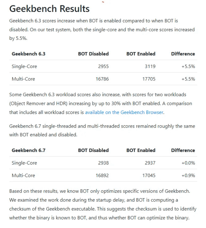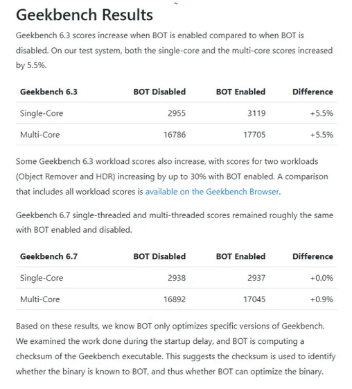 According to testing by the IT news site Tom's Hardware, Geekbench 6.3 showed a 5.5% increase in both single-core and multi-core performance when the BOT was enabled. On the other hand, Geekbench 6.7 currently shows almost no difference. Even if the BOT is optimized for 6.7, the results of that optimization will be treated as invalid and will not be used for comparison with other CPUs.