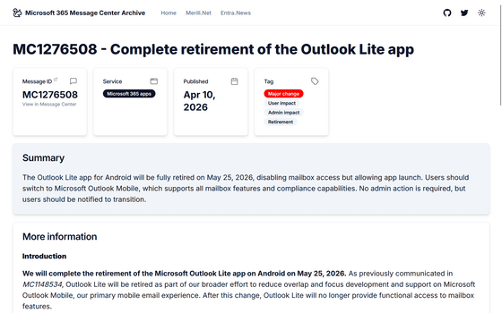 It has been announced that Outlook Lite, the lightweight email app for Android, which had been previously discontinued, will be completely discontinued on May 25, 2026.