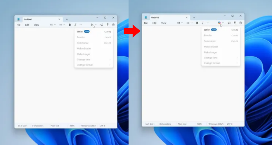 In fact, it has been confirmed that the Copilot button has been removed from some apps. Below is a screenshot of the Notes app provided by The Verge, with the left image showing the app before the change and the right image showing it after. The Copilot icon that was in the toolbar has disappeared.