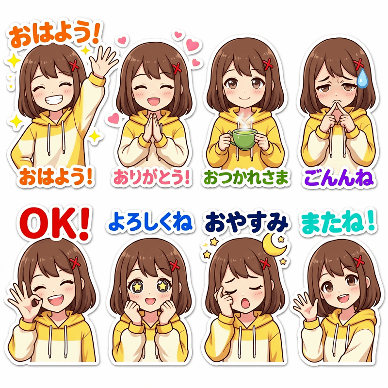 ERNIE-Image excels at drawing text and is also advertised as being able to control multiple objects as instructed. Below is an example of ERNIE-Image's work, which contains eight stamps with Japanese phrases in a single image. However, there are several errors, such as the prompt saying 'I'm sorry' becoming 'Gonnnne' and 'I'm looking forward to it!' changing to 'See you next time!'.