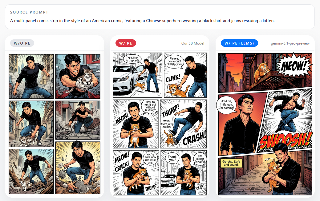 The converted long-text prompt looks like this. The prompt enhancer is a 3-billion-parameter language model based on