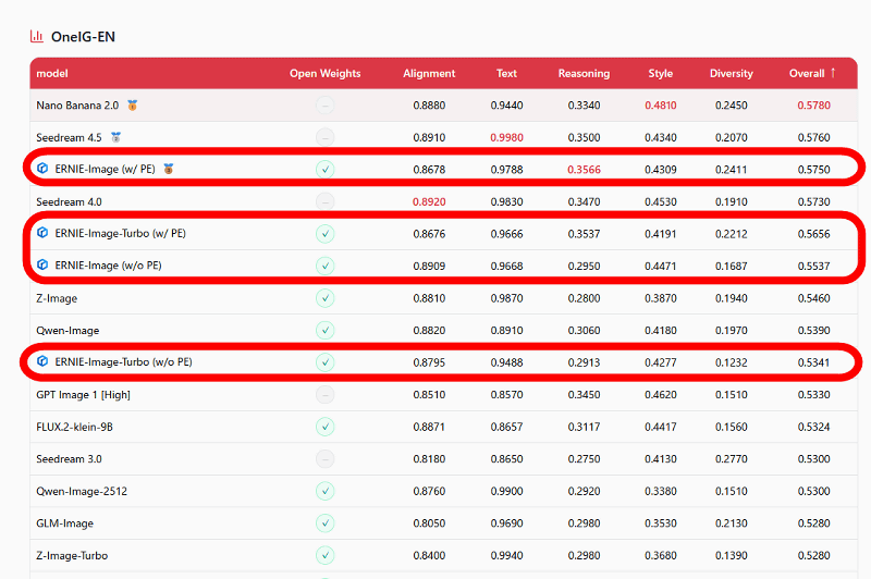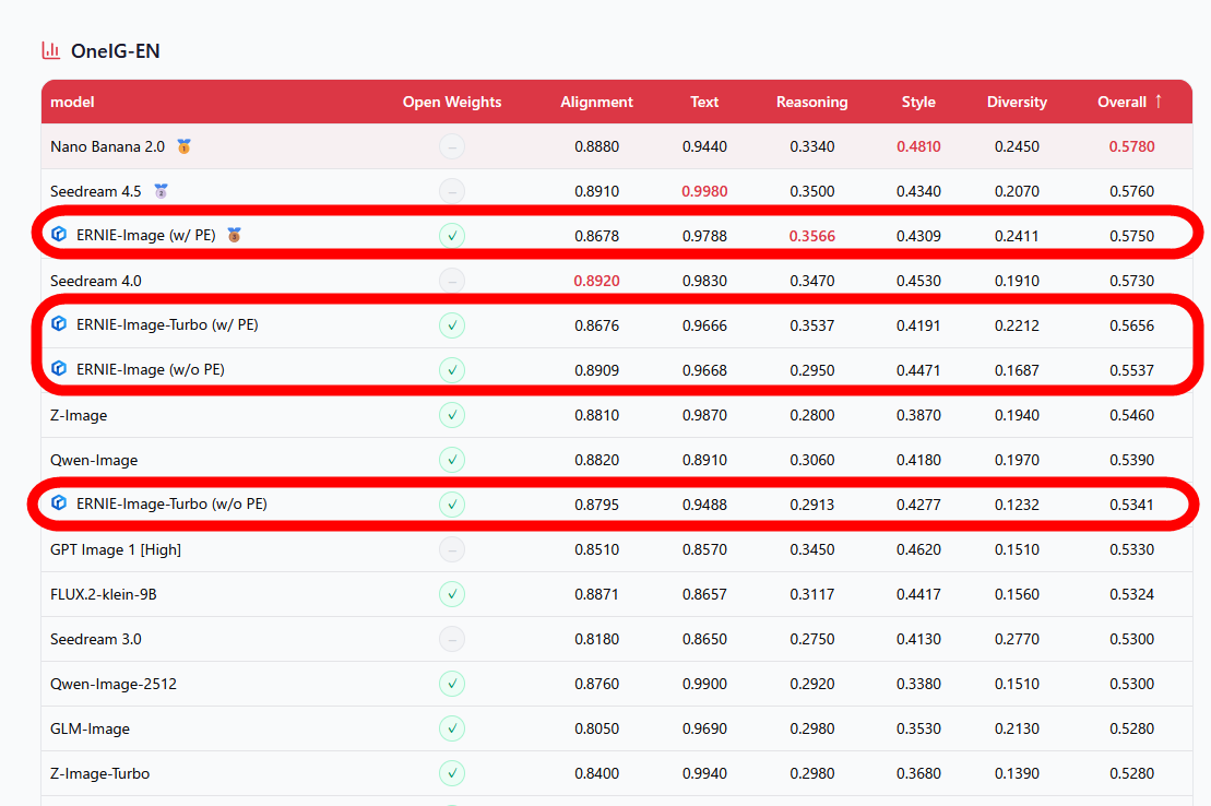 ERNIE-Image and ERNIE-Image-Turbo have consistently achieved high scores in various benchmark tests. In a test comparing image generation performance from English prompts using OneIG-Bench , they outperformed Z-Image and GPT Image 1 [High].