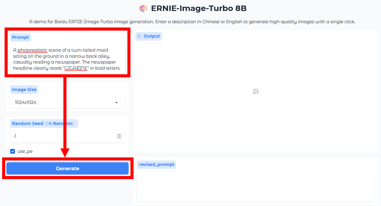 A demo app is available that makes it easy to try out ERNIE-Image-Turbo, so I actually generated an image using it. First, click the link below to access the demo app.