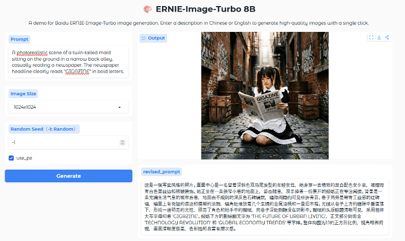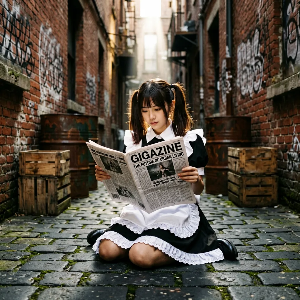 Enter the prompt 'A photorealistic scene of a twin-tailed maid sitting on the ground in a narrow back alley, casually reading a newspaper. The newspaper headline clearly reads 'GIGAZINE' in bold letters.' and click 'Generate'.