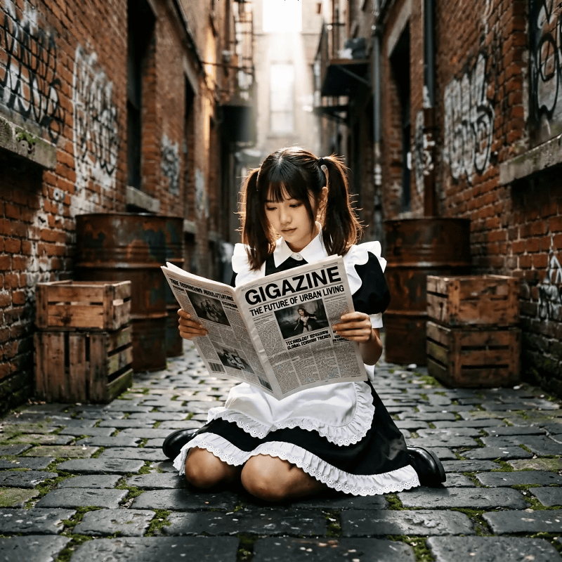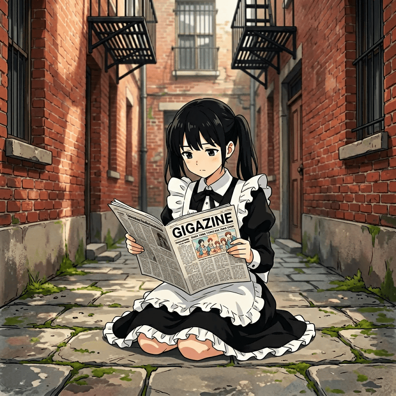 The prompt was, 'A Japanese-style illustration of a twin-tailed maid sitting on the ground in a narrow back alley, casually reading a newspaper. The newspaper headline clearly reads 'GIGAZINE' in bold letters.' This is what it would look like. High-quality illustrations can also be generated.