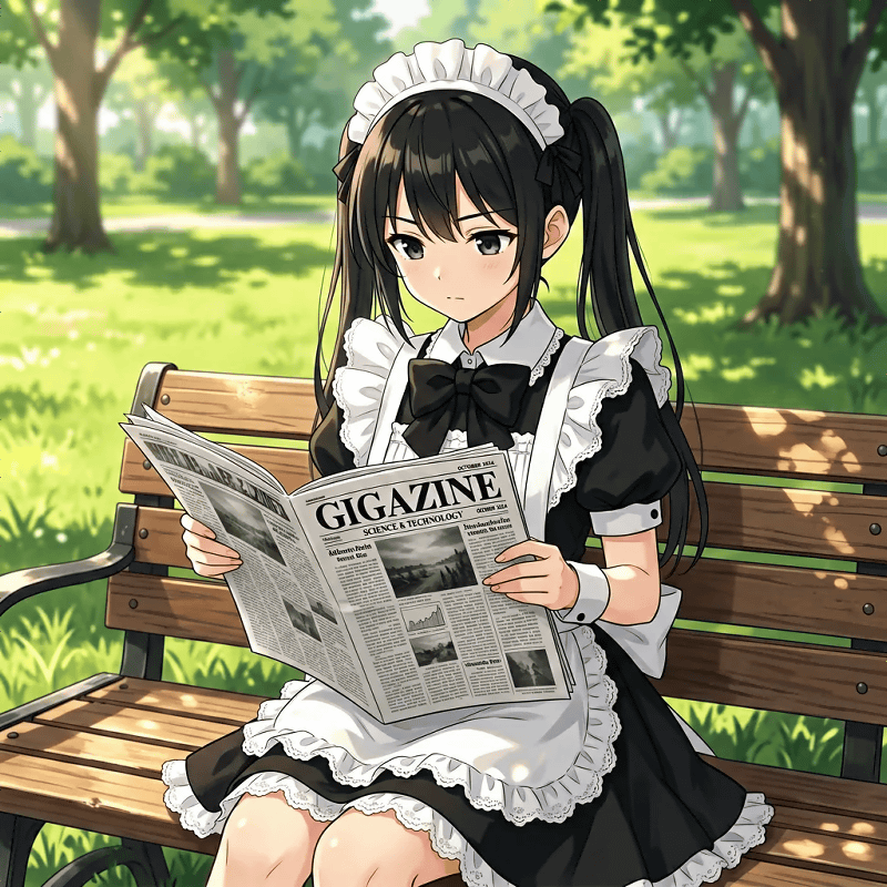 The following is the result of typing in Japanese: 'An illustration of a twin-tailed maid sitting in an alley reading a newspaper. The newspaper has the headline 'GIGAZINE' written on it.' Instead of an alley, it showed a park bench. Japanese is supported to some extent, but the prompt following ability seems to be reduced.