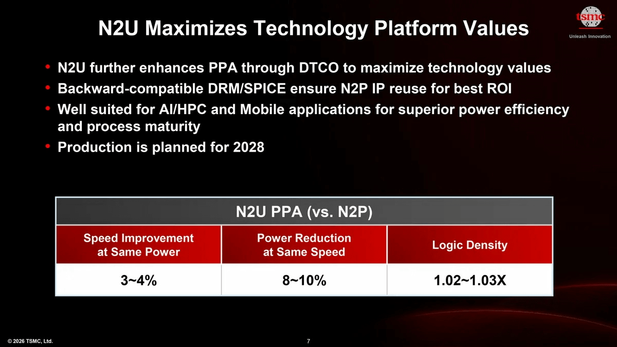 TSMC's 2nm process technology, 'N2U,' is an enhanced version of the 2nm platform that will achieve a 3% to 4% speed improvement, or an 8% to 10% reduction in power consumption at the same speed, as well as a 1.02 to 1.03 times increase in logic density compared to N2P, and is scheduled to begin production in 2028. The aim is to leverage the mature 2nm substrate and yield while maintaining compatibility with N2P IP assets to facilitate investment recovery, and it is described as a balanced option that can be used not only for client applications but also for AI, HPC, and mobile.