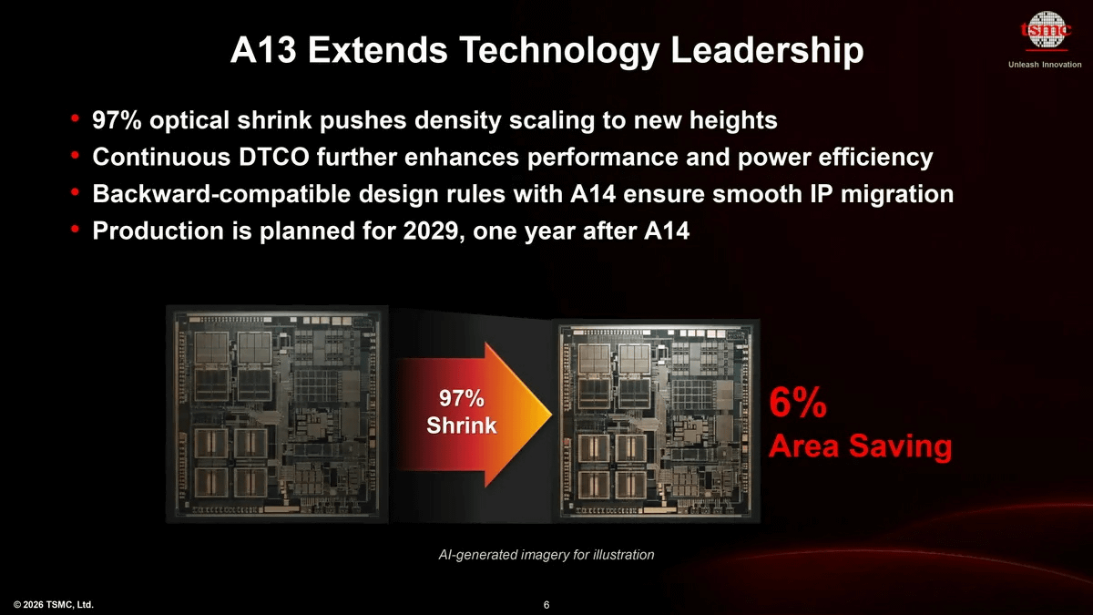 At its North America Technology Symposium 2026, held on April 22, 2026, TSMC presented a new semiconductor process roadmap looking ahead to 2029. The core of this roadmap includes the A13, a scaled-down version of the A14 ; the A12, which introduces backside power supply for AI and high-performance computing (HPC); and the N2U, an extended version of the 2nm generation. In addition, TSMC also unveiled technology plans for advanced packaging, automotive applications, and display drivers.