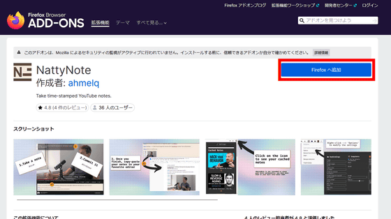 YouTubeには、投稿者が設定すればタイムスタンプを動画上に配置し、再生時間をクリックするだけで該当する場面にジャンプできる機能があります。Firefox向けの拡張機能である「NattyNote」を使えば、投稿者ではなく視聴者が気になる動画のタイムスタンプをメモすることが可能で、タイムスタンプが設定されていない動画でも簡単に好きな場面のタイムスタンプを記録することが可能です。